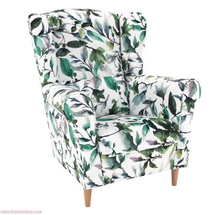 Kreslo ušiak, látka vzor lístie - nožičky drevené, CHARLOT
